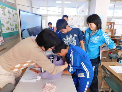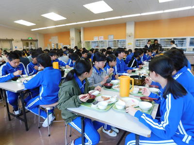 12月4日5校時目、「食に関する指導」にかかる栄養教諭・学校栄養職員派遣事業で、原町第一中学校の櫻井 長子先生にお越しいただきました。給食をおいしく食べるためのマナーについて考えました。