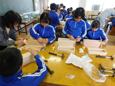 5年生はぷちストッカー(引き出し)、6年生は木製折りたたみ椅子を作りました。材料の木材は予め切られ、角もなめらかに処理されており、さらには釘を打ちやすいように目印まで付いている1人分ずつのキットは、さながら売り物のようでした。