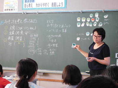 そこで、「みそ汁を考え、作ってみよう」をめあてに、南相馬市で作られている野菜を教えていただいた後、みそ汁作りのポイントを出し合い、一人ひとりが家族に作ってあげたいみそ汁を考えました。