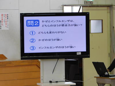 なぜ熱が出るのか、せきやくしゃみで飛び散ったウイルスはどうなるのか等、パワーポイントを用いて、全部で5問のクイズが出題されました。