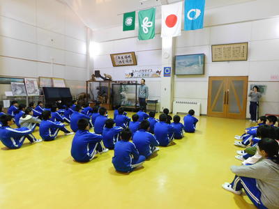 「交通事故(交通ルールを守る・自転車に乗る際はヘルメット着用)・火の事故(暖房器具を正しく使う・たき火はしない)・水の事故(凍結道路や池での氷遊びはしない)、誘拐(知らない人に声をかけられてもついていかない)に要注意です。自分の身は自分で守りましょう。」というお話でした。