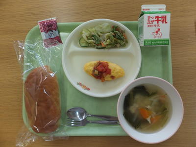 今日の献立は,コッペパン,オムレツのカラフルソースがけ,アスパラガスのサラダ,アルファベットスープ,大豆チョコクリーム,牛乳です。