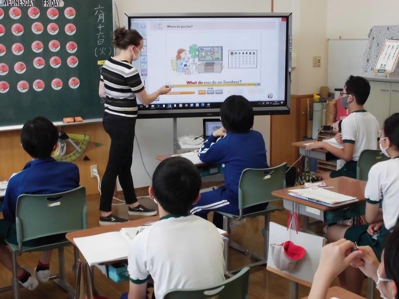 6年教室では外国語で、「ゲームを通して一日の生活を英語で言おう」の学習でした。