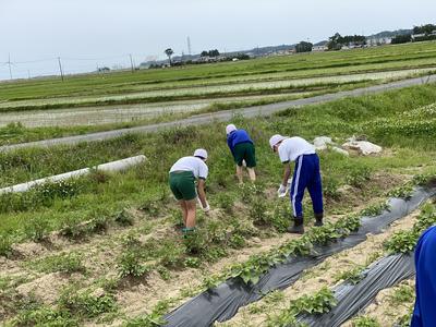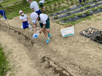 6年生は,豆の苗植えを行っています。昨年度よく育たなかった反省を生かして今度は苗まで大事に育てて植えています。あわせて,3年生のひまわりやジャガイモのところにも水やりをしています。優しい気持ちがあり,他学年の植物の様子も気になるようです。