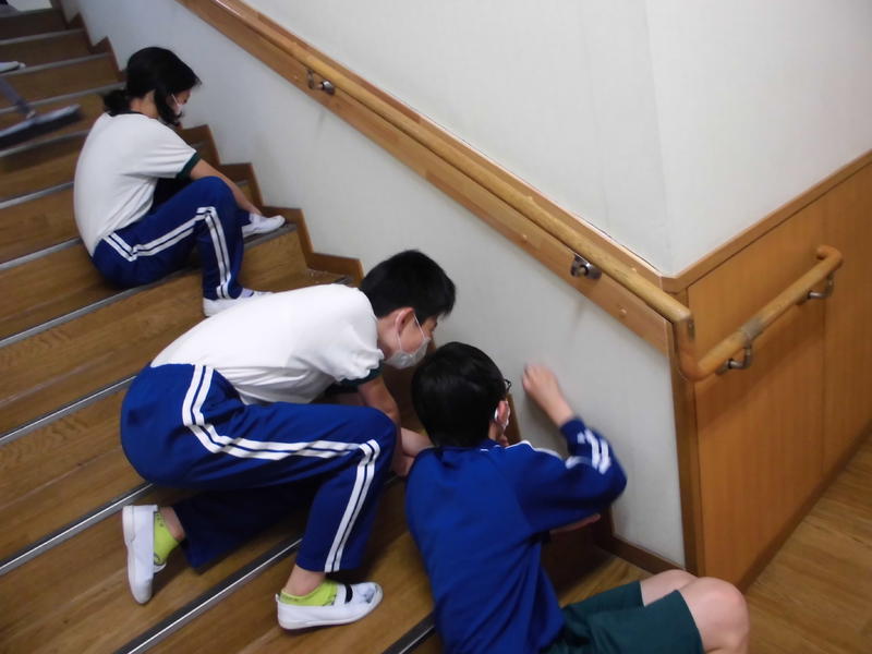 朝の活動時間,6年生が廊下や階段の壁の汚れや落書きを見つけて消していました。