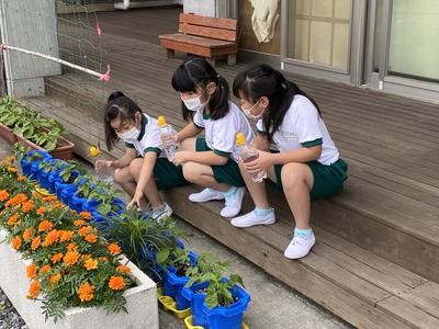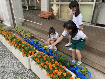 1年生はアサガオを育てています。毎朝水をやっては,その生長を楽しみにしています。今朝もその変化に声を上げて確かめています。