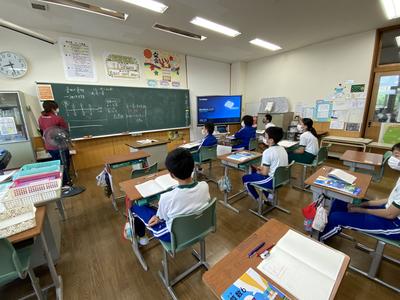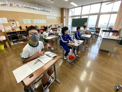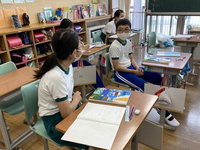 2020年6月22日 09時33分6年生は,算数で分数同士のわり算について学習しています。分数で割ることについて,図や式で説明しています。気付いたことについて,隣のともだちと距離を取って確認しています。