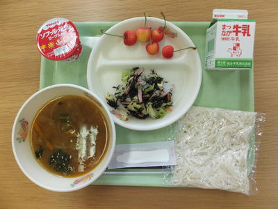 2020年6月24日 13時10分今日の献立は,「カレーうどん,ひじきサラダ,ヨーグルト,さくらんぼ,牛乳」です。