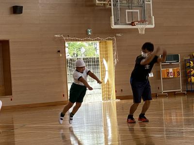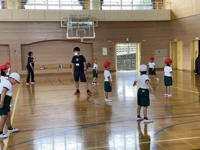 2020年7月7日 10時35分今日は,小学校体育専門アドバイザーの先生に来ていただいて1・2年生は体育の学習をしています。2年生にとっては,昨年度からお世話になっている先生で,また会えてとてもうれしそうです。雨で,校庭が使えないので体育館でサルやウサギやワニになりきって運動しています。