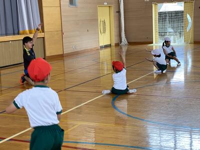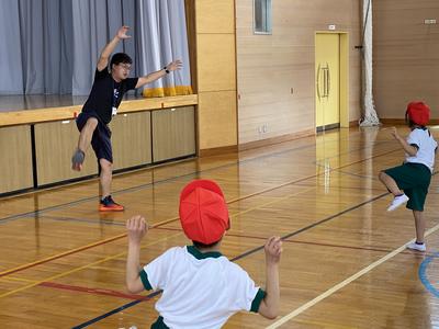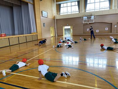 今日は,小学校体育専門アドバイザーの先生に来ていただいて1・2年生は体育の学習をしています。2年生にとっては,昨年度からお世話になっている先生で,また会えてとてもうれしそうです。雨で,校庭が使えないので体育館でサルやウサギやワニになりきって運動しています。