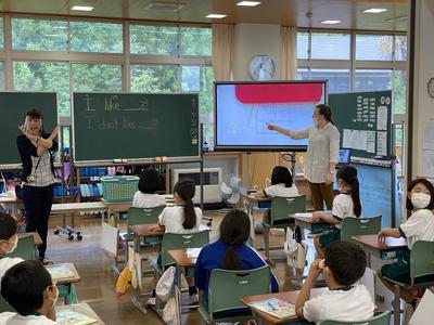 3年生は,外国語の専門の先生とALTの先生と楽しく学習しています。今日は,好きなものと嫌いなものを書いたカード当てクイズをしています。書いてある言葉を先生の後に続いて英語で発音し,誰が書いたカードかを当てようと真剣に考えています。