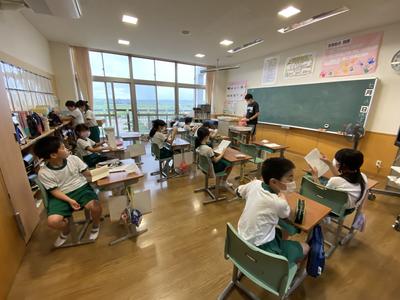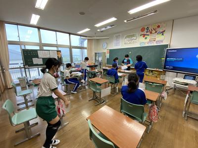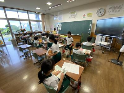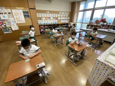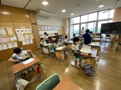 登校時に前が見えないくらいの雨が降りましたが,子ども達は元気に登校しています。前日の片付けや朝の学習,読書,清潔検査の準備にそれぞれの教室で過ごしています。