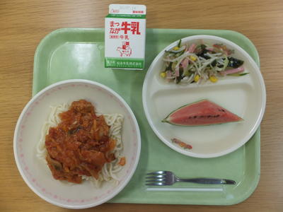 2020年7月8日 12時50分今日の献立は,ツナとトマトのスパゲティ,こだますいか,海藻サラダ,牛乳です。