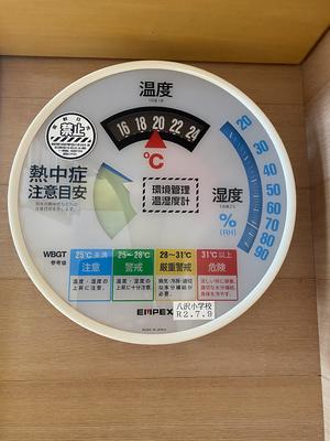 先週からの曇り空が,気温を低くしており,真夏とは思えない寒さが続いていますが,今週末からまた気温が上がりはじめ,来週は蒸し暑い日がありそうです。本校では,校舎と体育館に熱中症指標計を設置しており(本日は気温も低く,左側の注意目安に表示は出ていません),計測して子ども達の安全に注意しております。本校利用の各団体様におかれましても,これを参考にして安全に運動ができるようにしてください。