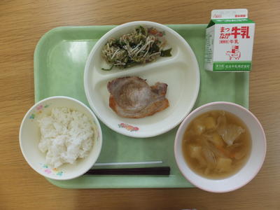 2020年7月20日 12時40分今日の献立は,ごはん,キャベツと豆腐のみそ汁,豚肉の生姜たれかけ,野菜の梅あえ,牛乳です。