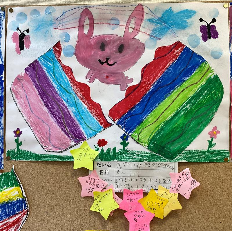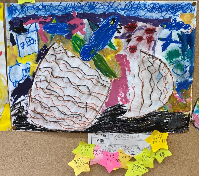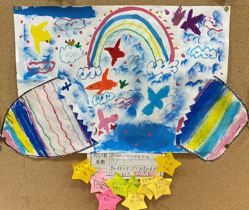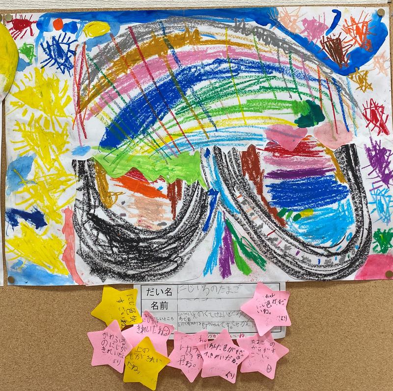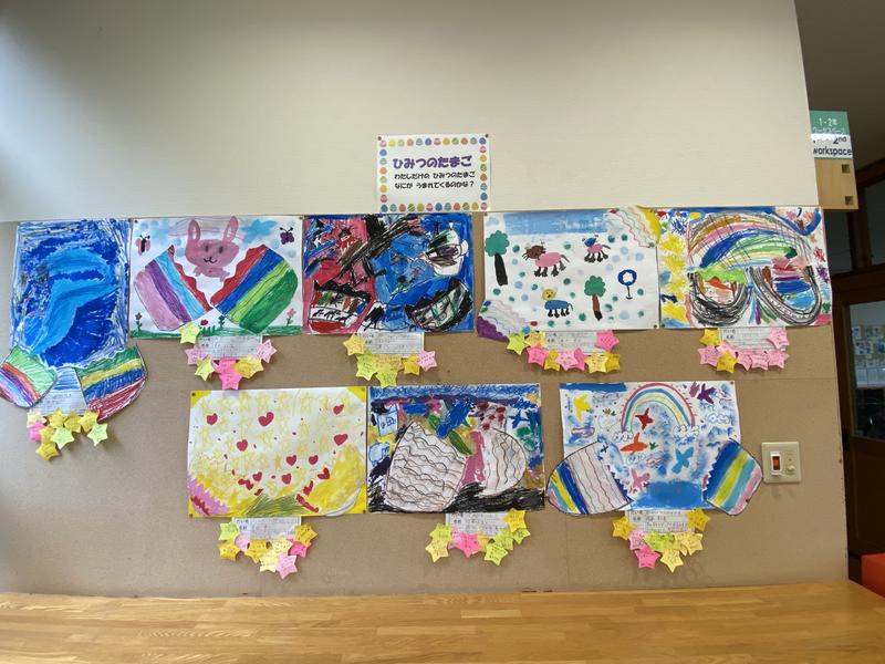 今回は2学年の図画工作科「ひみつのたまご」です。子ども達は,思い思いのたまごから生まれるひみつについて描き,お互いのよさについて付せんを使って認め合うことができました。