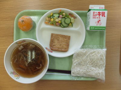 2020年7月22日 12時45分今日の献立は,きつねうどん,油揚げ煮,まめまめサラダ,冷凍みかん,牛乳です。