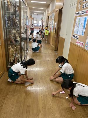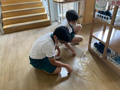 2020年8月5日 08時00分学期末の大掃除の一環として,廊下の靴のゴム跡落としにボランティアを募ったところ今朝もたくさんの子ども達が協力してくれました。専用のスポンジでこすってみると,みるみるきれいになっていく様子にうれしくなっているようでした。