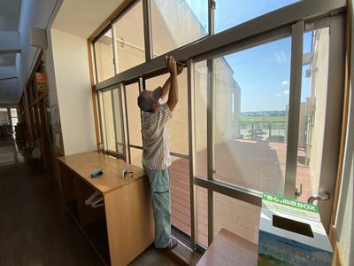2020年8月26日 09時53分市からアミ戸の設置をしていただきました。これで,換気の問題も解消です。また,涼しい浜風も吹いてきて,よりよい環境で学習ができます。ありがとうございました。