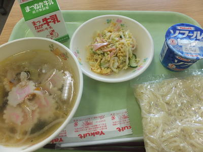 2020年8月26日 12時45分今日の献立は,塩ラーメン,中華サラダ,ヨーグルト,牛乳です。