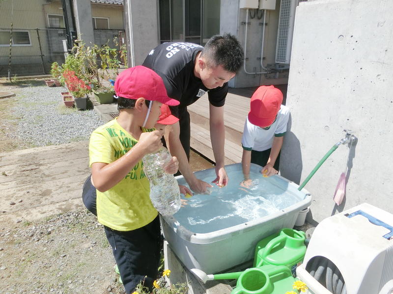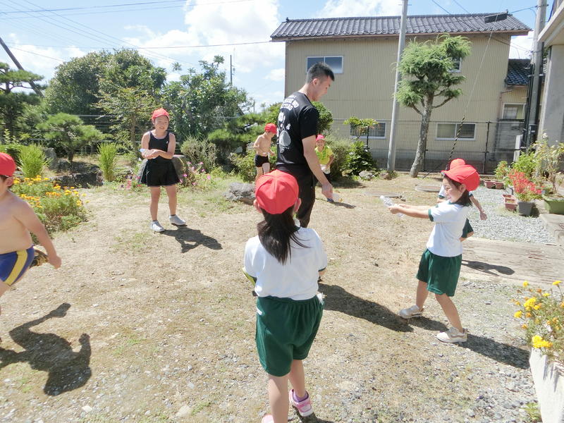 ペットボトルを水鉄砲にして、互いに水を掛け合いました。
