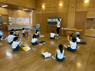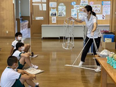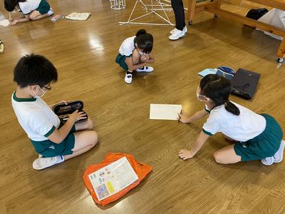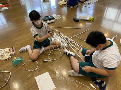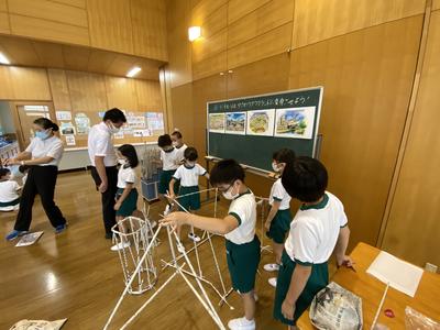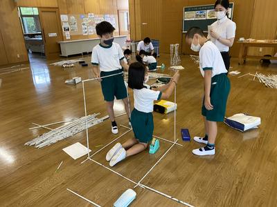 2020年8月31日 10時49分4年生は,ランチルームで図工の学習をしています。新聞紙を丸めて作った棒をつなげてYASAWAワクワクランドを作っています。なかなか立体を作ることが難しいようで,グループ全員が支えながら作っています。