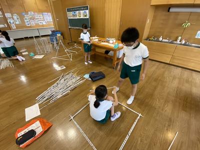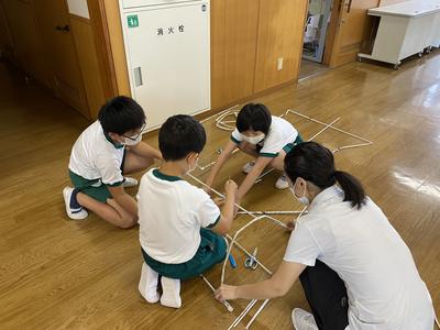 4年生は,ランチルームで図工の学習をしています。新聞紙を丸めて作った棒をつなげてYASAWAワクワクランドを作っています。なかなか立体を作ることが難しいようで,グループ全員が支えながら作っています。