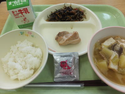 2020年8月31日 12時40分今日の献立は,ごはん,キャベツのみそ汁,鶏肉のレモン醤油かけ,ひじきの炒め煮,梅じそふりかけ,牛乳です。