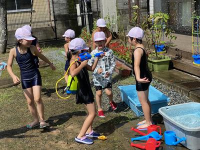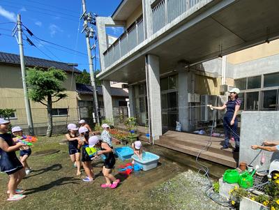 2年生は,外で水遊びをしています。昨日までの曇り空とうって変わり,今日はとても天気がよくとても楽しそうです。