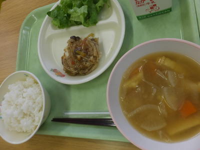 今日は,「呉汁」についてです。大豆を水に浸し,すりつぶした物を「呉」と言います。この「呉」をみそ汁に入れた物が「呉汁」です。大豆は「畑の肉」と言われ,植物性のタンパク質が多く含まれています。体の筋肉や血,骨を作ってくれる大切な働きをしてくれます。大豆と野菜がたくさん入った栄養満点の「呉汁」をしっかり食べて,体を元気にしていきましょう。