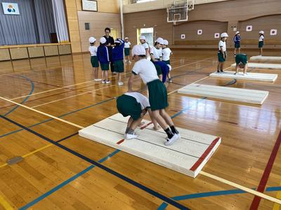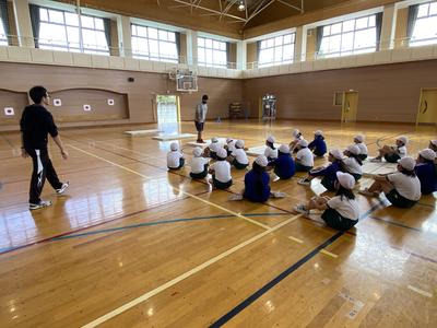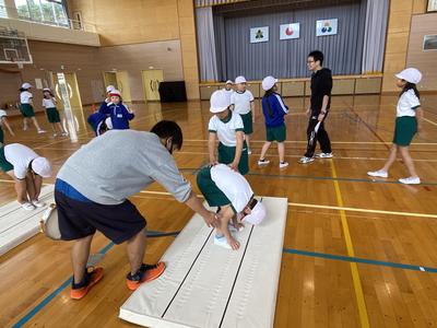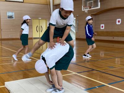 4校時目は,3年生が体育です。跳び箱の準備ということで3年生も馬跳びにチャレンジしています。1年生よりも少し高くなり,連続して跳ぶなど,レベルが上がっています。