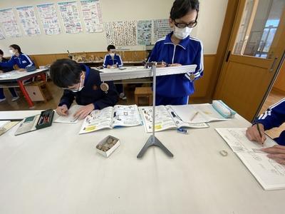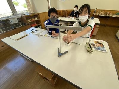 6年理科は、テコの原理について学習しています。支点の位置をずらすことによって重いと感じる違いを体感し、実験用テコで支点から力点までの距離が重りの重さに反比例することに気付きました。算数が関係していることにとても驚いたようです。