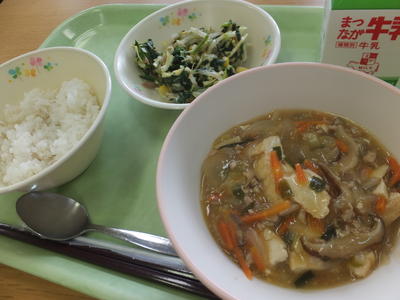 今日の献立は,麦ごはん,麻婆厚揚げ,ほうれん草の中華和え,牛乳です。