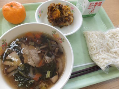 2020年12月9日 12時45分今日の献立は,なめこうどん,冬至かぼちゃ,みかん,牛乳です。
