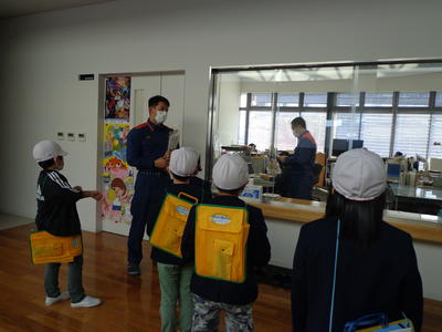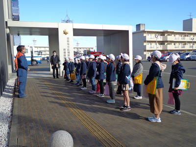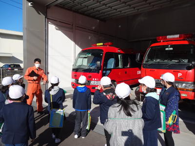 2020年12月9日 10時45分3年生社会では,地域の安全を守る消防署について校外学習を行っています。署員の方から説明を聞いたり,司令室の様子を見学させていただいたりしています。真っ赤な消防車を間近に見ることができてとてもうれしそうです。