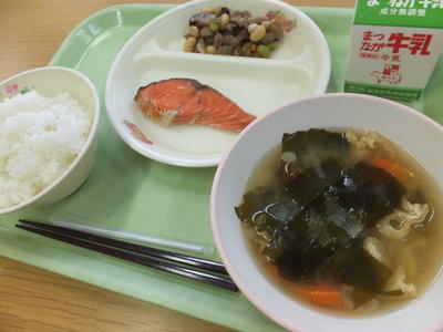 今日の献立は,ごはん,鮭の塩焼き,五目豆,わかめのみそ汁,牛乳です。