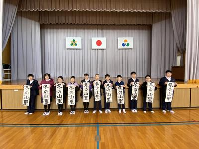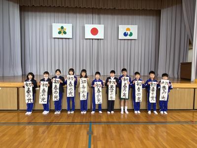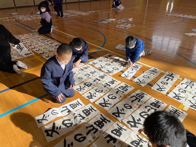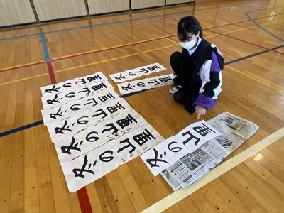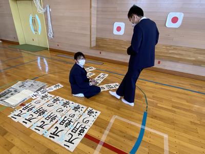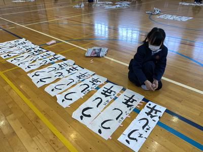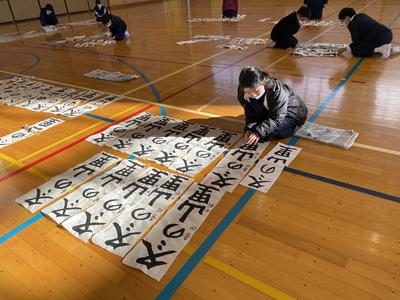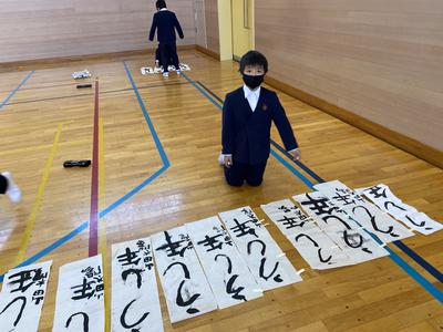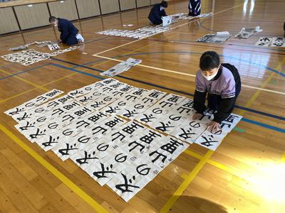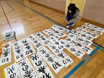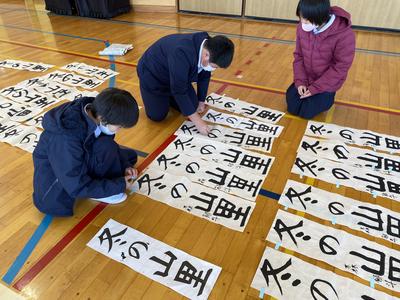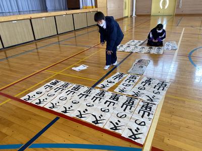 2021年1月8日 13時09分この冬休みに子どもたちは書きぞめの作品作りを頑張りました。中には,用紙全部使用して作品作りを行いました。今日は,すべての作品についてお手本をもとに,ポイントが抑えているか付せんを使ってチェックしています。