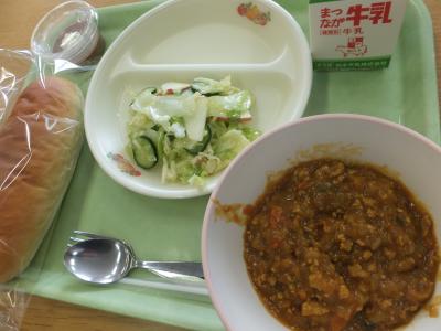 今日の献立は,コッペパン,キーマカレー,フレンチサラダ,手作りココアプリン,牛乳です。