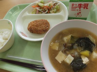 今日の献立は,ごはん,キャロットメンチカツ,キャベツと昆布のサラダ,なめこ汁,牛乳です