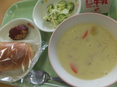 今日は、「牛乳」についてです。給食にでてくる、200ミリリットルの牛乳には、骨や歯をつくるカルシウムが227ミリグラム含まれています。1日にとってほしいカルシウム量の約3分の1の量です。体がどんどん大きくなっている成長期の子ども達の今の時期にカルシウムはとても大切な栄養素です。成長期にしっかりとカルシウムをとって骨を作らなければ、将来、骨がかすかすの状態になる「骨粗鬆症」という病気になってしまうこともあります。今日は、コーンポタージュにも牛乳が使われています。しっかりと食べたり、飲んだりすることと、体を動かしたり、運動することによって、さらに丈夫な骨や歯が作られます。今日も残さずに食べましょう。