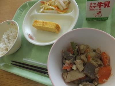 今日の献立は,麦ごはん,厚焼き卵,白菜漬け,煮しめ,牛乳です。