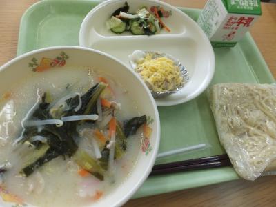 今日は,ラーメンに入っているネギについてです。ネギは独特のにおいのもとである硫化アリルを含んでいます。包丁などでネギの細胞が傷つけられることにより,におい成分が発生します。このにおいは交感神経をしげきして体温を上昇させます。体温の上昇は,風邪のウイルスを退治するマクロファージが活発になることから風邪の予防になり,脂肪の燃焼も促進させてくれます。選ぶときには,重さがあり表面が乾燥せずハリがあり,触ったときにフカフカしないものが良品です。今日は豆乳塩ラーメンに使われています。残さず食べて,風邪に負けない体を作りましょう。