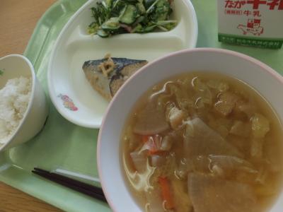 今日の献立は,麦ごはん,さばの味噌煮,ごまドレッシングあえ,野菜たっぷり汁,牛乳です。