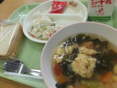 今日の献立は,食パン,イチゴジャム,マセドアンサラダ,イタリアンスープ,牛乳です。