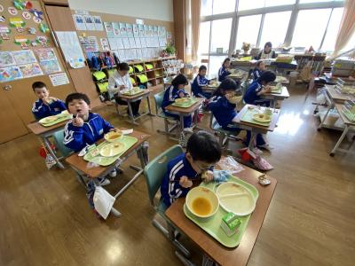 今年度の給食も残りわずかとなりました。今日から校長先生と一緒に給食を食べています。今日は,1年生の様子です。