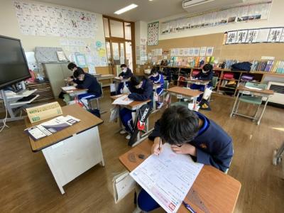 6年生算数は、まとめのテストを行っています。今年度、家庭学習と授業を関連づけた学習を行なってきましたが、どのくらい身に付いたか確認します。小学校の内容をしっかり身につけて中学校の「数学」につなげたいです。