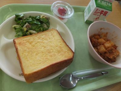 今日の献立は,フレンチトースト,ポークビーンズ,グリーンサラダ,イチゴゼリーorココアプリン,牛乳です。
