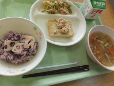 今日は、小高区4小学校の閉校を記念した献立です。そこで、紫黒米を入れてお祝いのごはんを炊きました。そのごはんに小高の特産物の「れんこん」と、さらに小高は「紅梅の里」であることから、ゆかりを使い、『小高絆 ごはん』として提供します。今日は、小高の特産物の「れんこん」の入った「小高絆ごはん」とともに、生揚げの肉みそがけ、もやしのカレーあえ、のっぺい汁、牛乳をよく味わって食べましょう。