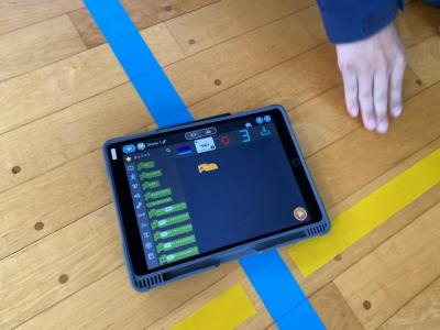6年理科では、ドローンを使った授業をしています。最後の内容は、自分でプログラムした内容でドローンを飛ばします。バーを越えたり、マットに着地したりするたびに得点が入ります。どのようなプログラミングで、うまく飛ばせるか、試行錯誤しながら取り組んでいます。