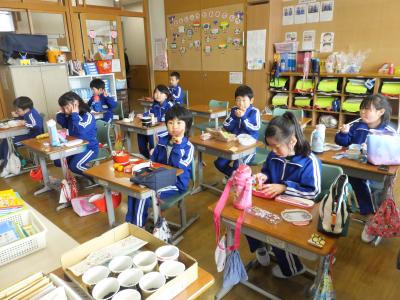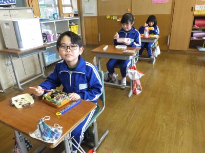今日から来週月曜日まではお弁当になります。(5年生は明日から)色とりどりのお弁当に心なしか子ども達もうれしそうな表情です。今日は,1・2年生のお弁当を紹介します。
